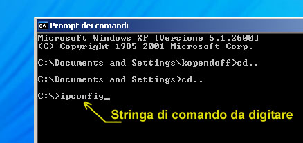 3.1 Dal prompt di DOS digitare il comando "ipconfig" e premere INVIO