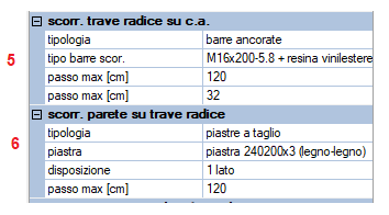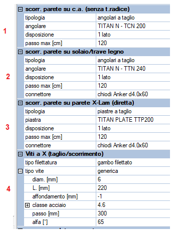 2. Scorrimento Per quanto riguarda lo scorrimento la gestione delle connessioni è più articolata e sono presenti quindi diverse sezioni che verranno automaticamente adeguate alle configurazioni specifiche delle singole pareti che fanno riferimento alla data parete tipo: parete tipo senza trave radice 1. parete su c.a. (senza trave radice) 2. parete su solaio o trave in legno 3. parete su parete 4. dati viti a X usate per taglio scorrimento se la parete tipo è dotata di trave radice il menu presenta alcune differenze 5. trave radice su c.a. 6. parete su trave radice Una singola parete tipo gestisce tutte le opzioni di connessione a scorrimento adattandole alle varie pareti associate. |