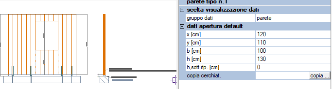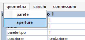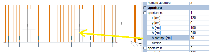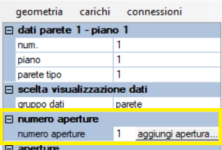 Per creare aperture nella parete selezionata: menu 'geometria' => 'aperture' e indicare il numero di aperture o usare la funzione 'aggiungi apertura' per inserirne di nuove