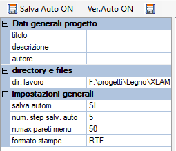 | dati progetto Vengono qui indicati titolo, descrizione, autore del progetto, oltre che la directory di lavoro, oltre a : - salvataggio automatico del progetto ogni 'num. step salv. autom' passi - n. max pareti riportate nell'elenco del menu ad albero