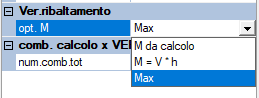 | - Opt. M: opzione per il calcolo del momento per la verifica a ribaltamento M da calcolo : sollecitazione importata o assegnata al piede del singolo tratto - M = V * h : calcolato in funzione del taglio agente sul singolo tratto/maschio e la sua altezza - Max : massimo valore tra i due precedenti Nota: questo parametro è presente anche nelle singole pareti tipo. Modificandolo in questa sezione (dati di calcolo) verrà automaticamente modificato su tutte le pareti. Per maggiori dettagli vedi 1. Ribaltamento |