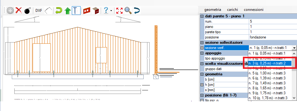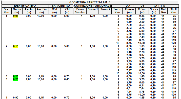 Di default vengono letti i dati relativi alla sezione 1 (quota 0.05 m), ma nel caso di sottofinestra 20 cm per esempio le prime 2 sezioni (a quota 0.05 e 0.15 m) rappresentano la parete a sezione unica (come fosse un unico "maschio") mentre le reali caratteristiche vanno lette alla sezione n. 3 (a quota 0.25 m) che indica infatti la presenza di 2 tratti (maschi).