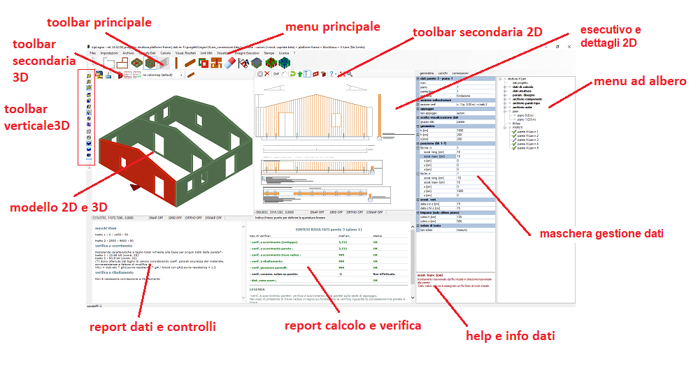 Il software presenta un'interfaccia intuitiva con accesso immediato a tutte le informazioni, le rappresentazioni 2D e 3D, la gestione dati e i report di controllo e verifica: