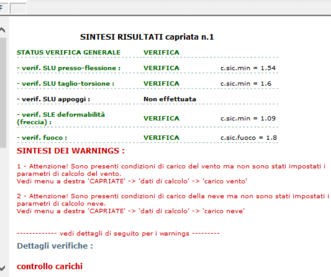 Sintesi dei risultatiI risultati delle verifiche sono sintetizzati nel report principale. In questa maschera sono anche riportati eventuali warning di controllo. I risultati per ogni singola trave sono invece indicati nel report secondario: