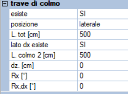 - L. tot : lunghezza totale della trave/i di colmo. Questa grandezza determina le dimensioni del solaio di copertura gravante sul colmo, nel caso sia impostata questa opzione di carico. se il colmo è posto in posizione laterale : - lato dx esiste : è possibile avere il colmo anche sul lato destro - L. colmo 2 : lunghezza della seconda trave di colmo