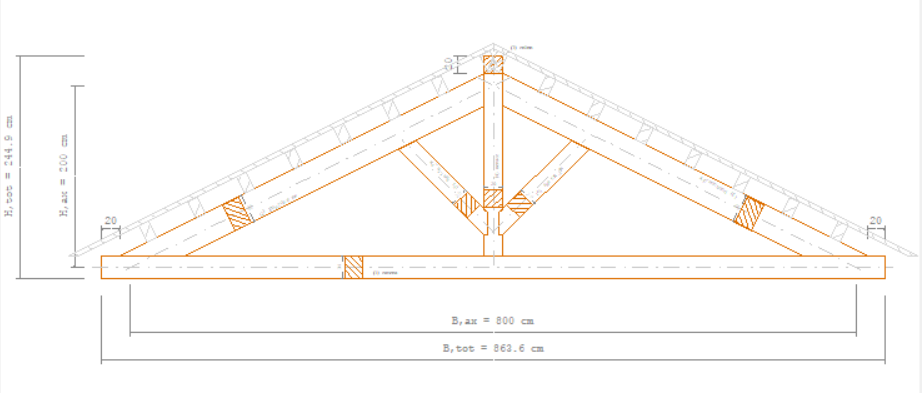 se il colmo è passante e posto superiormente al colmo (estradosso) la lunghezza complessiva della trave di colmo è definita da L. tot, di cui una parte sarà disposta sul lato destro - L. dx : porzione della trave di colmo a destra della capriata