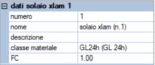 Nella prima sezione dati vengono indicati : - nome e descrizione del solaio - classe del materiale equivalente - FC : fattore di confidenza (calcolato in automatico in base al livello di conoscenza LC impostato nei dati del progetto) |