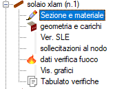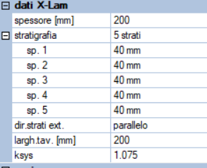 dati X-Lam viene qui definita la stratigrafia indicando: - spessore : è calcolato in automatico in base alla stratigrafia. Modificando questo valore verrà automaticamente ricalcolata la stratigrafia in base al numero di strati assegnato (default = 5) - stratigrafia : numero di strati (modificando questo dato verranno ricalcolati in automatico gli spessori in base allo spessore) - sp.1,2,3... : spessore del singolo strato (viene automaticamente ricalcolato lo spessore complessivo) |
