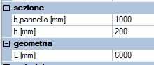 sezione e geometria - b,pannello : larghezza del pannello (non ha effetti sulla verifica perchè i carichi sono forniti a m2) - h : altezza-spessore del pannello (calcolato in automatico) - L : lunghezza complessiva del pannello (calcolata in automatico in base alle campate definite nella sezione geometria e carichi) |