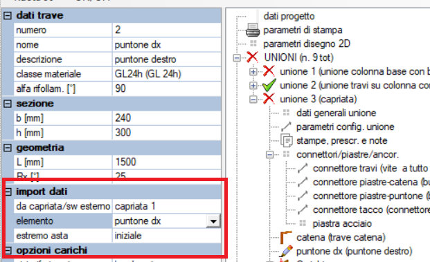 Unioni generiche e capriateIn alternativa o in aggiunta alle unioni generate in automatico è possibile mettere in relazione unioni generiche con gli elementi di una capriata. Utilizziamo in questo la procedura simile a quella di import dati da progetto esterno: scelta l'unione che vogliamo progettare (modulo UNIONI) associamo l'import dei dati alla capriata di riferimento e indichiamo l'elemento della capriata a cui fare riferimento (e l'estremo). |