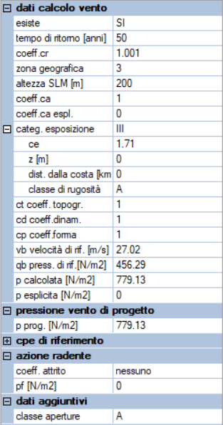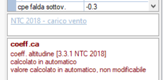 parametri calcolo ventoIl carico il vento può essere calcolato come previsto dalle NTC impostando i vari parametri della maschera dati. Il significato delle singole voci è riportato automaticamente nella parte bassa della maschera alla selezione di ogni singola voce: