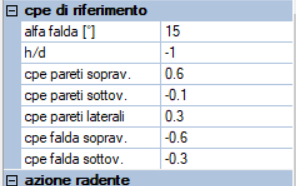 coefficienti di forma cpei coefficienti di forma verranno calcolati automaticamente in base alla pendenza delle falde delle singole capriate, sia nella condizione sopravento che sottovento. Quelli riportati in questa sezione non sono utilizzati nel calcolo ma solo riportati a titolo di esempio in base a una pendenza standard.  |
