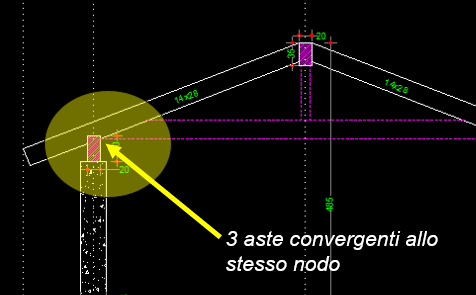 In particolare le sollecitazioni ricavate da un calcolo FEM ai fini della verifica delle connessioni possono risultare non corrette e sottostimate perchè non tengono conto di quale sia la reale linea di trasmissione dei carichi : nell'immagine a destra le 4 aste convergono indistintamente nello stesso nodo al quale è applicata un'unica forza sismica. |