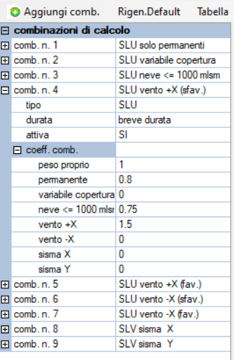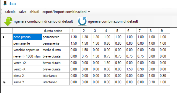 Queste combinazioni sono generate in automatico in base a quanto previsto al §2.5.3 delle NTC 2018 e sono riportate nei tabulati di calcolo