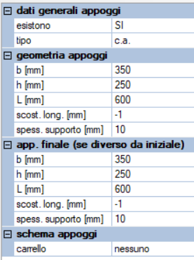 - b, h, L : dimensioni degli appoggi - scost. longitudinale : scostamento dell'appoggio rispetto all'estremità della catena (se presente) - spessore supporto: se è presente un elemento di interposizione all'appoggio (es. piastra neoprene) |