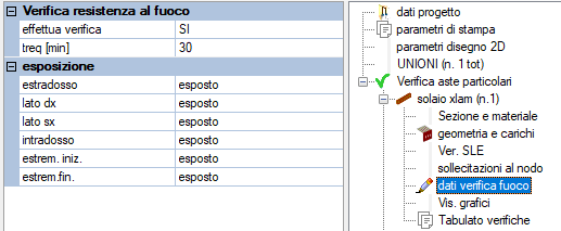 dati verifica al fuoco- effettua verifica: Si/No per effettuare la verifica - treq : tempo di resistenza di fuoco richiesto - esposizione: per ogni lato è possibile indicare se è esposto o meno, determinando così la sezione ridotta efficace |