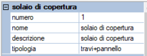 Nel primo gruppo di dati vengono gestiti numero, nome e descrizione del solaio. E' inoltre possibile scegliere la tipologia tra: - solaio a travetti + tavolato/pannelli - solaio X-Lam |