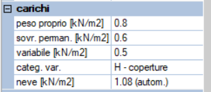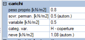 in questa sezione è possibile assegnare il valore di carichi e sovraccarichi distribuito sul solaio. Nota: il carico neve se impostato su "automatico" nei parametri di calcolo neve verrà automaticamente assegnato ai solai di copertura |