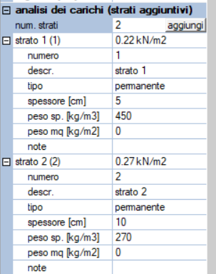 analisi dei carichi in una sezione successiva è possibile anche effettuare un'analisi dei carichi inserendo diversi strati (menu aggiungi) definiti per: - tipo : peso proprio o permanente - spessore dello strato è possibile indicare alternativamente: - peso specifico [kN/m3]: il carico a m2 verrà calcolato in base allo spessore - peso mq [kN/m2]: sovraccarico a m2, lo spessore ha solo funzione di rappresentazione grafica per eliminare uno strato indicare uno spessore = -1 oppure selezionare la voce relativa allos trato e eliminarlo