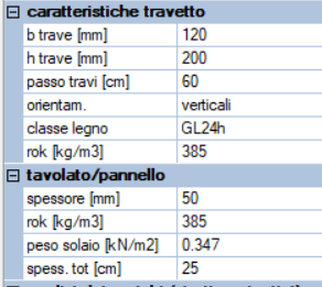 solai a travetti e tavolato per questa tipologia è possibile definire: - b, h : dimensioni della sezione del travetto - passo travi - orientamento: se il solaio verrà assegnato a un elemento con estradosso inclinato (es. capriata o parete) i travetti evrranno automaticamente disegnati come 'verticali' o 'inclinati' - classe del legno del travetto - rok : massa volumica del travetto - spessore tavolato rok : massa volumica del tavolato spess. tot e peso del solaio sono calcolati in automatico |