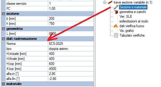 La gestione delle travi a sezione variabile segue la stessa impostazione delle TRAVI SU PIU' APPOGGI con l'unica differenza nella definizione della rastremazione che avviene in una specifica sezione presente nel menu Sezione e materiale: