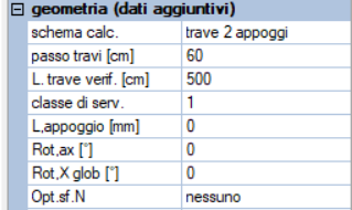 geometria - schema di calcolo es. trave su 2 appoggi - passo travi : passo dei travetti - L.trave verif : luce di verifica del solaio - classe di servizio - L.appoggio : se > 0 effettua la verifica degli appoggi del travetto (compressione ortogonale alle fibre) |