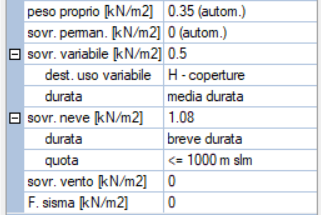 sono qui riportati una sintesi dei carichi (presenti anche nella sezione geometria) con l'aggiunta di: - sovraccarico vento - Forza sisma : se presente inserisce altre 2 combinazioni di carico e verifica del travetto considerando la sollecitazione da sisma ripartita tra i travetti e gli appoggi |