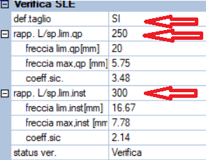 possono essere assegnati: - la deformabilità a taglio nel determinare la deformazione - il rapporto Luce/spostamento limite in condizioni rare (istantanea) e quasi permanente (finale) sono quindi riportati i valori della freccia limite e di calcolo nelle 2 condizioni, nonché i coefficienti di sicurezza e lo status di verifica |